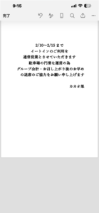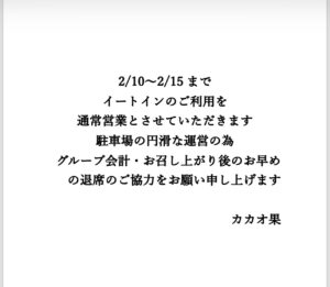 2/15までの営業について※再投稿 お知らせ いつもご来店誠にありがとうございます イートイン利用のお問い合わせを多くいただきましたので再検討させていただきました。 2/11もイートインご利用可能と変更いたしました。 Screenshot 2月の営業について 前の記事